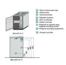 Čelični toplovodni kotlovi BIO-CET B predviđeni su za loženje krutim gorivom, a namijenjeni centralnom grijanju objekata te kuhanju hrane. Izrađuju se u dvije izvedbe (lijeva i desna), nazivnog toplinskog učina 18, 24 i 30 kW. Prostoriju u koju su ugrađeni griju i kroz gornju grijaču ploču. Sam naziv “etažni” ne isključuje njihovo korištenje za zagrijavanje i više od jedne etaže, ako je potreba za toplinom u skladu s njihovim nazivnim učinom. Ugrađivati se mogu na zatvorene i otvorene sustave centralnog grijanja.