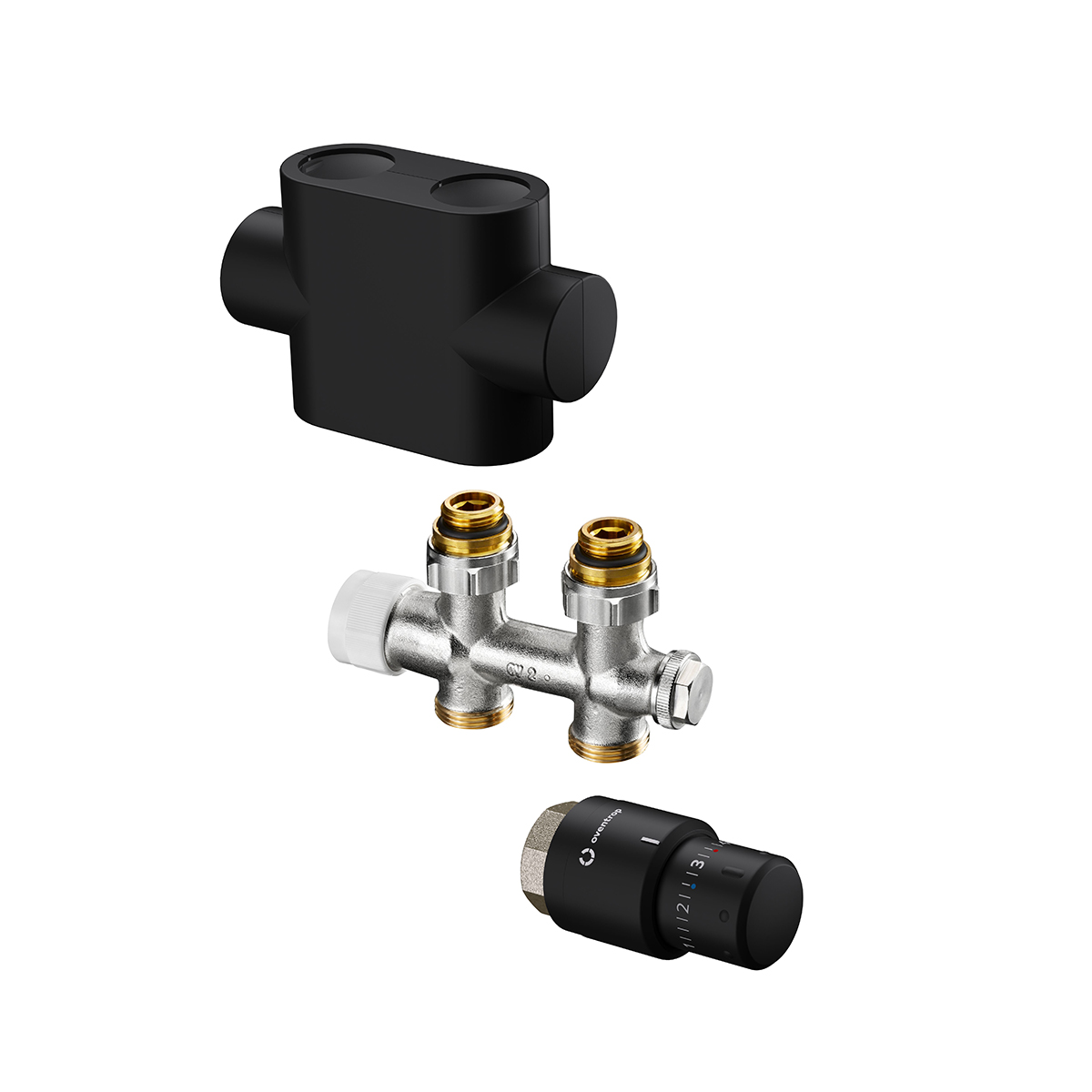 Za uporabu na radijatorima s priključkom dovodne i povratne cijevi. Razmak između osi cijevi 50 mm. Oznaka OV 2 na tijelu ventila. Mat crni Multiblock T setovi imaju moderan dizajn i posebnu površinu s anti-fingerprint efektom (otpornu na otiske prstiju).